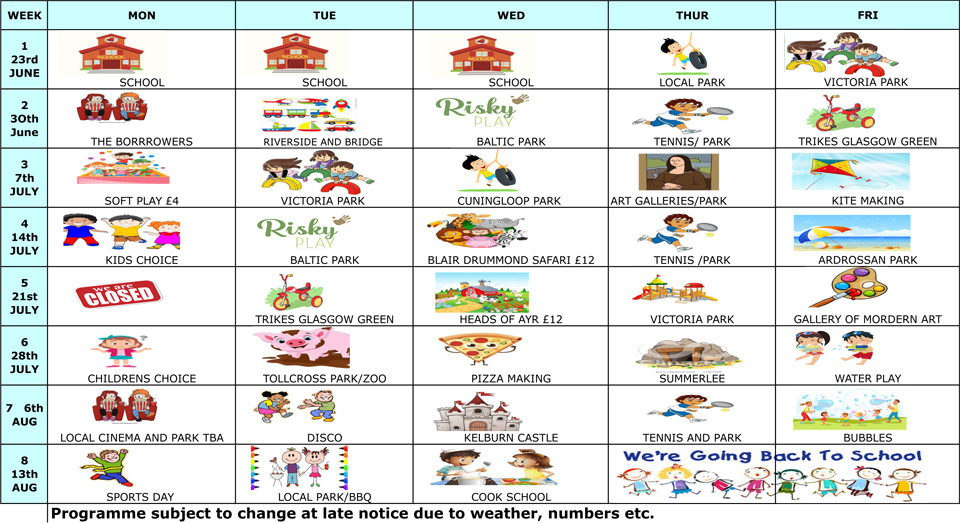 Children must be able to dress themselves to attend the swimming activities. * Programmes are subject to change and may be changed at short notice due to weather conditions etc.